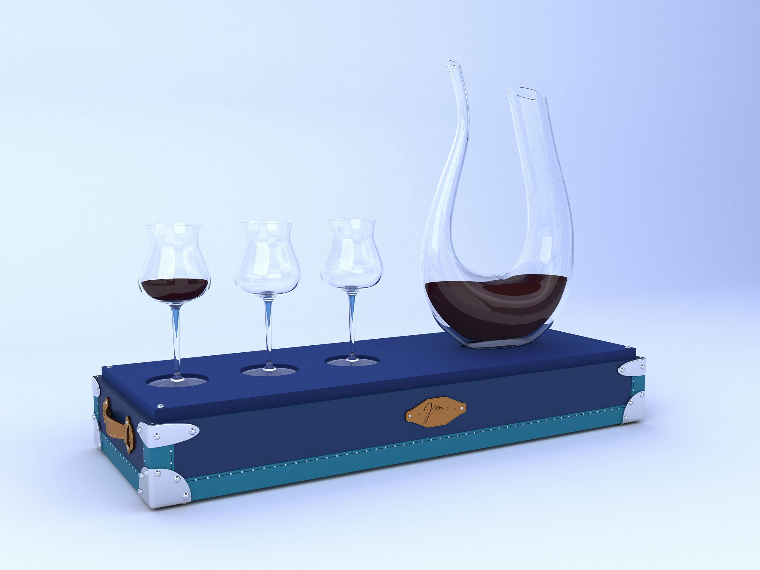 This elegant trunk stand enhances the decanting of a grand cru by housing its decanter and tasting glasses.